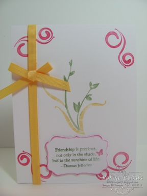 I used one of the new hostess sets that you can get starting in July. I love this set. I used the swirl set and my markers to ink up different parts for the other elements on the card. The main image has the complete stamp inked up. Here is my creation.