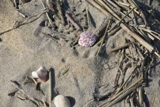 When I got up this morning I was trying to figure out a way to show the mounds of sand the wind makes to hide my treasures. I decided to tear paper and sponge the edges. I took Kraft and made my card and 3 panels to act as dunes. I tore the 3 panels and sponged the edges. I then used the spritzer tool and added some Chocolate Chip to give it some dimension. I taped the edges of my Kraft paper down and left the sponged edge untaped so it would add some depth. Next I took my faux sea glass and trimmed it up and cut it down. I found some seashells I had collected from a beach trip and started determining the placement of all my beach items. Then I had to glue it all down and let it dry. Here is my final creation.