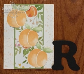 I began by stamping the background with the dots from Awesomely Artistic. I off stamped the ink first so it would be really light. I then cut a piece of Pear Pizzaz and a piece of the Fruit Stand dsp and layered them onto the middle of my card. I stamped my Peach 3 times and added the leaves. I then cut them out. They ended up being a little larger than the original layout of the card in the magazine so I modified my placement of the fruit. Here is my completed card.