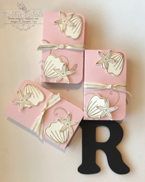 To make the holders I took a piece of card stock a little larger than the box. I rounded the corners and stamped the bottom. The scoring was based on the thickness of the box. To hold the box inside I created a band that was wrapped around the box and then stuck to the inside of the holder. The personalized sentiment was printed on the computer and cut and glued to the inside front cover. The shells were stamped and embossed with gold and then punched out. They were attached with glue dots. To finish the box off I used some of the gold natural trim to tie around the holder. Here is a picture of a few of them.