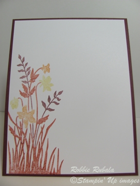 I saw the colors Daffodil, Pumpkin Pie, Cajun Craze, and Bravo Burgundy. I wanted to create a silhouette type image for the card so I stamped my image from Just Believe in Staz-On Black. Next I started with my Daffodil and I tried sponging on the color. This was not giving me the intensity I wanted so I switched to my sponge daubers. This was better but I had to be careful to avoid the circle you get if you press to hard when you have inked your dauber. I continued with the Daffodil until I was happy with my color.