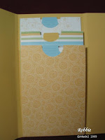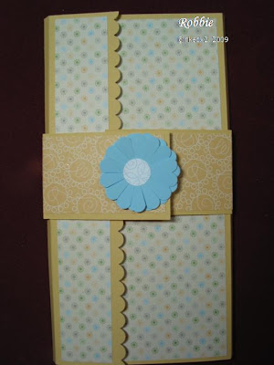 Stamps: Totally Tabs Paper: Bashful Blue, So Saffron, Delicate Dots (SAB) Ink: Bashful Blue Accessories: scalloped circle – scallop edge – 3/4″ punches