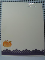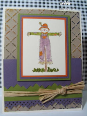 With the new demo agreement, I went searching for some sites that focus on Stampin’ Up products. I found some great ones and in the process also found some new challenges. Today’s card uses one of the challenges on one of the new blogs. I chose the color challenge at the Pals Paper Arts blog. This is a new Stampin’ Up focus blogs and they have some great challenges. I combined it with Tracy’s sketch at her Eat Sleep Stamp blog. I did flip the sketch as my image fit better that way. I really like the color combo of Old Olive, Perfect Plum, and Pumpkin Pie. I added in Kraft for my background. I used an aqua painter to color the scarecrow. Here is the sketch and my creation.