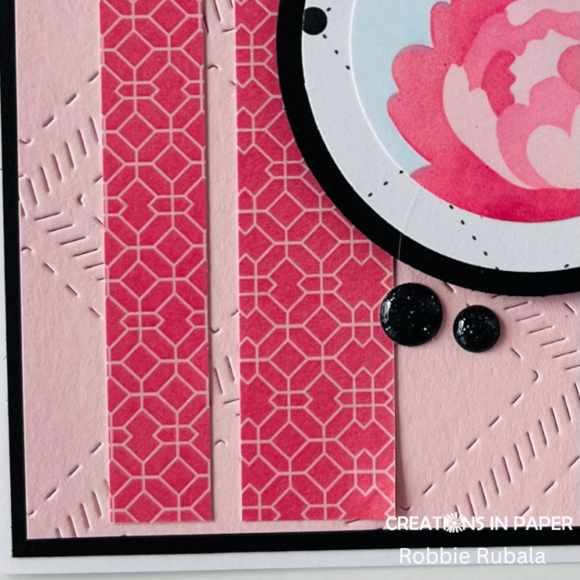 To make sure the background is still highlighted a couple of stripes of pattern paper were added. The use of black is a perfect combination for the pink and sets the image off. To tie in the black layers some black gems were used.