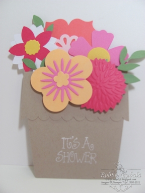 My daughter and her friend are giving a shower nest weekend. She asked me to make the invitations. The mom-to-be is a huge gardener so my daughter is going with a garden theme. We talked about some ideas for the invitations but she really liked the flower pot and flowers idea. I cut out the flower pot and made flowers from punches, dies, and sizlets. She then designed the flowers on the card. Here is what the final card looked like.