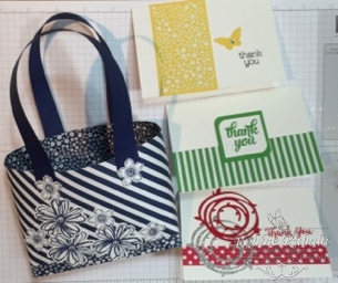 With this theme I thought it would be fun to do something other than a card.  I did some thinking and thought about what little gift I could make for Zoie’s teacher.  Teachers always need note cards so I decided to do a cute little purse with some notecards inside.  I used the Night of Navy as the purse and the other colors for the note cards inside.  I made 6 note cards – 2 of each design.  Here is my cute purse and note cards.