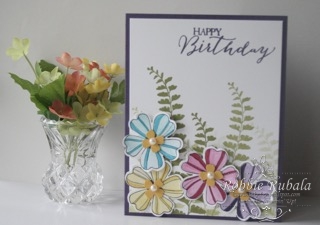 I had an idea in my mind when I started this. I thought it would be interesting to stamp the fern in the background and put the punched flowers on them. After I punched the flowers, they needed something so I took my markers and added some color to the stripes on the flowers. As I was making this card I remembered that a few ladies had asked for some birthday cards. I decided to use the birthday sentiment so I had a card for them. Here is what my final card looked like.
