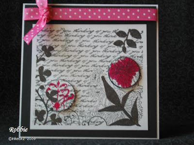 Stamps: Fresh Cuts Paper: Basic Black, white Ink: Palette Noir Black Accessories: Basic Black – Pink Passion markers, 1″ circle punch, Spica microflake black pen, ribbon (Michael’s), sticky tape, dimensionals