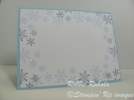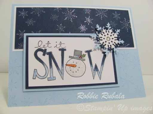 I thought if I flipped the sketch it would be perfect for the Big on Christmas set which I have not used in a long time. I wanted to use Bashful Blue as that was a color I haven’t used in a while. I combined it with Night of Navy. Now all I needed to do was create my card. I added some glitter pen to the sentiment and snowman. I stamped the snowflakes on the Navy with White Craft and embossed with Iridescent Ice. The Snowflakes are from the snowflake die in the mini. I used the Shimmery White for the small one. I also added a rhinestone in the center Here is what I created.