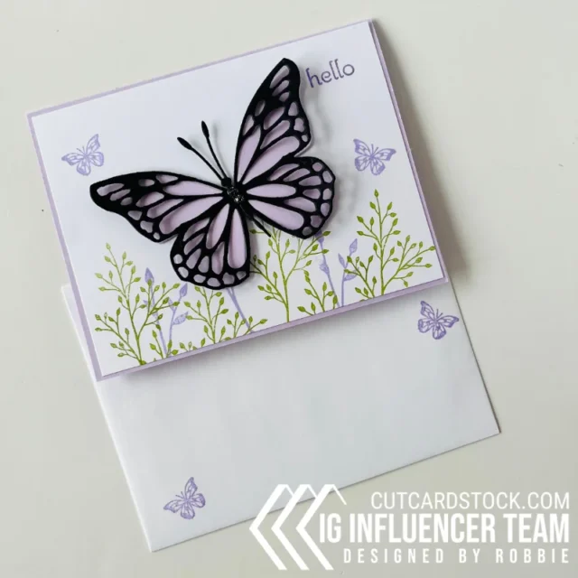 This die set cuts out the solid body, the lacy wings, and the body. The Hydrangea Purple cardstock Is a soft pastel color perfect for this card base.