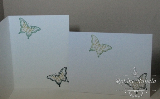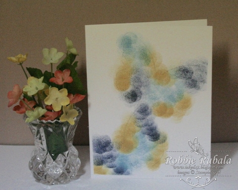 To make my card I cut a 4″ x 5 1/4″ layer. I cut out my butterflies but kept the cut out. I took this layer and place it on the top of my card base. I used post-it notes to mark the sides so I did not apply color past the layer on the card base. I also used a pencil and lightly traced around the cut outs so I knew where I had to apply color. I then used sponge daubers to add my colors.