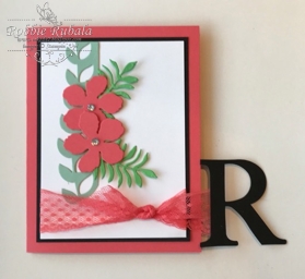 I am so sad to see Botanical Builder retire. I love this set and use it a lot. I chose to use the leaf strip in place of the banner. I cut it out of Mint Macaron. The flowers were cut out of Watermelon Wonder and the leaves were from Cucumber Crush. Using a white background I added the leaf strip using glue dots. Glue dots were also used to attach the leaves to the flowers. My flowers were added using glue dots and dimensionals. I used some retired Watermelon Wonder lace trim to tie around the bottom of the panel. My white panel was attached to my Basic Black panel. These panels were attached to my Watermelon Wonder card base. I finished off my creation with rhinestones in the center of the flowers. Here is my creation.