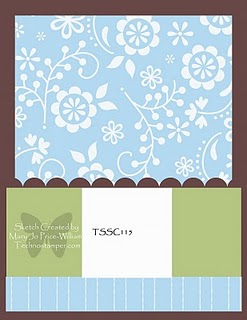 This is going to be short and sweet when it comes to the card. My creation today uses Mary Jo’s Monday Lunchtime Sketch. The sketch is great for using up some of the designer series paper before it retires so I grabbed my pack of Tea Party. I don’t have much of this left so I think I have done well with this pack. I added a punched flower in the upper corner to tone down the paper. I also added ribbon on the diagonal on the bottom panel. I created a mirror image of the ribbon on the opposite side. Here is the sketch and my creation.