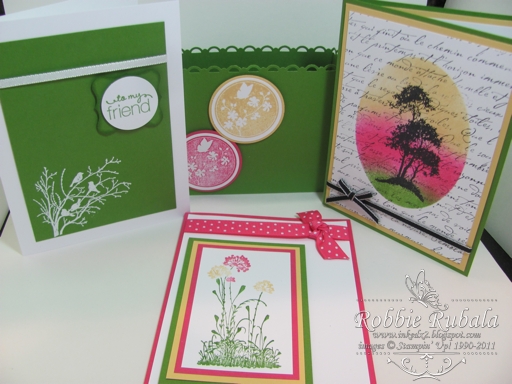 I chose the 3 images and we are using the circle on the front of the box. I used 3 different ways to use the images to give some variety. Since this was a card set, I chose to use the same 3 colors – Gumball Green, Melon Mambo, and So Saffron. Here is what the ladies will make.