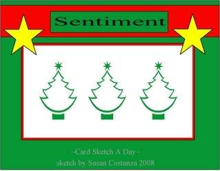 I recently found a great website that offers a different card sketch each day. Susan at Card Sketch A Day creates a new sketch every day and offers visitors a chance to create a card and post it on her blog. You then need to post it to your blog on the same day it is released. I loved her sketches and asked for a Christmas Tree sketch (she works a month in advance so that is why I got the Christmas Tree). I knew what set I wanted to use but worried about the size. I ended up having to make a 5 x 7 card instead of the invitation size. I added lots of glitter and Stickles to the trees so they are sparkly. I really like how this card turned out and will modify it to make some to send out this Christmas. Here is the sketch and my creation.