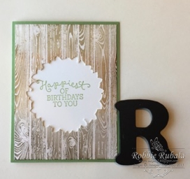 In the original card there was a colorful background with a heart cut out. I decided to use the Hardwood background and 3 different colors to get the gradient idea. I then used the Wonderful Wreath framelit to create my cut out. It then had a sentiment in the center of the heart. I chose to use a birthday sentiment in the center of mine. I left the rest of my card as is so that this card could be used for a guy. If you had some leaf framelits they would be perfect to add to the card. Here is my version.
