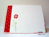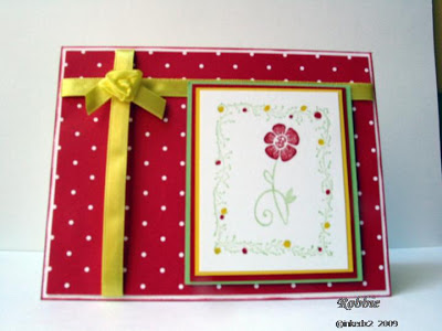 I saw on a couple of blogs cards that had ribbon roses on their cards. Christine posted some great directions but there is also a good tutorial here. I played with this and made a rose that I used on this card. Here is my creation.