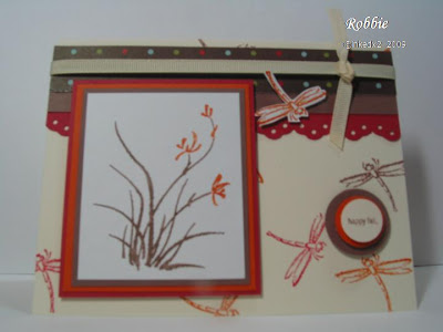 Today’s card used the sketch from the Caardvarks blog along with the color challenge from the Color Throwdown blog. Caardvarks had 3 sketches to choose from. I chose to use sketch 2. The required colors to use were Close to Cocoa, Pumpkin Pie, and Ruby Red. The pumpkin pie was a challenge as I didn’t have patterned paper that had that color in it. I was able to incorporate it though. Here is the sketch and my creation.