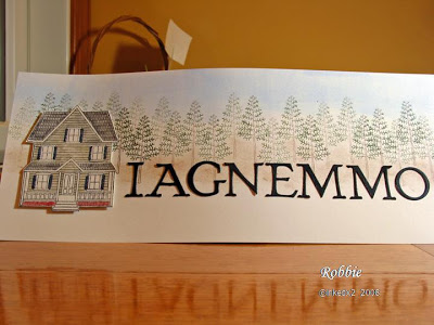 I began by stamping the house on my good paper and again on another piece of paper. I used a picture I had taken of the house to watercolor the house like his. See the cute shutters. Well the house stamp does not have shutters on it so I had to hand draw them in. Not bad if I say so myself. After coloring the top image I colored the one on the good paper (when you layer if you color the image underneath, if you don’t line the 2 images up exactly your eye won’t notice it as the coloring is the same.