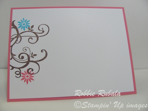 I thought it would be fun to take the 3 panels and look at it as 1 panel, stamp an image, and then cut it into 3 panels. I chose to use Baroque Motifs and create the enter image. I second generation stamped the swirl then added the flowers. I used my marker to color the pearls but it didn’t work very well. I will need to find out some tips that will make it work better. The rest is pretty easy to figure out from the card.