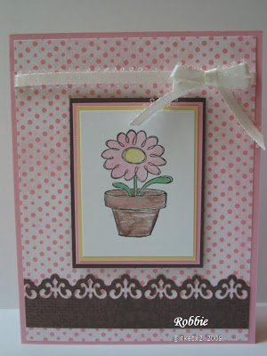 Today’s card was really fun to work on. I used the sketch from the Eat Sleep Stamp blog and my colors came from the Colour Create blog. When I started I wanted to use some of my soon to be retired designer papers. I was able to find some Pretty in Pink and Chocolate Chip designer papers. In my search I discovered I had no paper that used Barely Banana. When I looked in the catalog and even in past retired papers I could not find any that used Barely Banana. Because of that the only Barely Banana is a layer on my image panel. I still like the final product but would have liked to use more of the yellow. Here is the sketch and my creation.