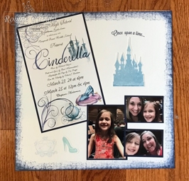 I finally got my scrapbook page finished and photographed. Jess and I took Zoie to see the play Cinderella at a local high school. She really enjoyed it and we got a few pictures for her page. I used the cover of the program and mounted it onto Night of Navy. I used Timeless Textures to ink the edges of the page. The images are from a set I have that I bought to make the Disney scrapbook pages from our trips there. Here is the page.