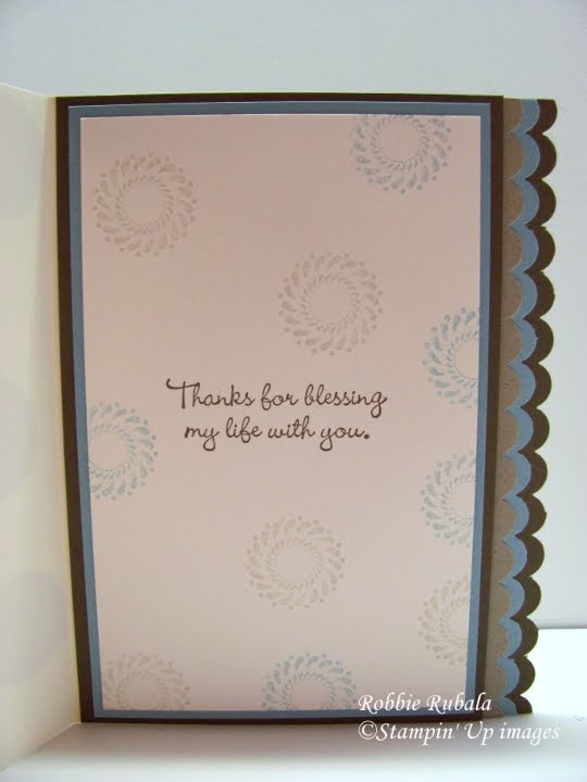 Stamps: A Beautiful Thing, Great Friend, Herb Expressions Paper: Baja Breeze, Kraft, Soft Suede, Very Vanilla Ink: Baja Breeze, Sahara Sand, Soft Suede Accessories: 5/8″ – 3/4″ – 1″ circle and scallop border punches, white & vanilla taffeta ribbon, linen thread, sponge dauber, Zots