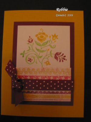I got a chance to do some stamping yesterday. I made several cards that I will post over the next few days. Today’s card was made for the Clean and Simple challenge on Splitcoast Stampers website. I chose to use the image from Razzle Dazzle as I have seen lots of cards with this image but didn’t really know how I could use it. This idea just came to me as I was sitting there trying to decide what to do. It didn’t show up in the picture, but I used my Stardust Gelly Roll pens to add some sparkle on the flower. Here is my creation for the challenge.