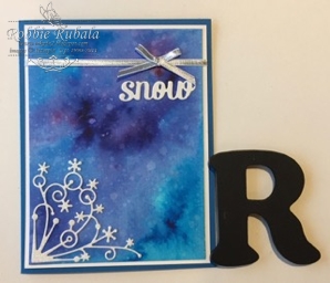 I played with some of my Colorbursts the other day when I was having a watercolor play day. I used a blue and a purple to create a background. After it had dried, I sprinkled water on it and used a paper towel to blot the water off. This takes off some of the ink and leaves dtops that look like it is snowing. I mounted this on a piece of white using Tear & Tape. I added some silver ribbon and then attached the layer to a Night of Navy card base. I used some Dazzling Diamonds glimmer paper to cut out a snowflake corner die I had. This was attached using Tombow glue, To finish off the card I used a piece of Shimmer Paper to cut out the word snow. Here is my completed creation.