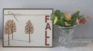 These colors were similar to the ones I used a few days ago so I decided to do some thinking about this one. I decided to try something. I pulled out my White Christmas stamp set. I stamped the trees and then I used the leaves stamp from Sheltering Tree to fill it in with Fall colors.