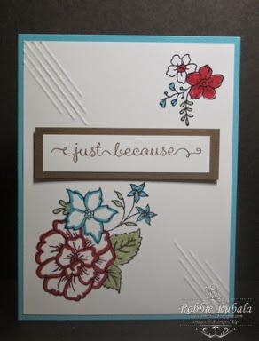 I thought this combination would be really challenging but once I decided on my stamp set the rest just fell into place. I decided to use a new hostess set and so some coloring. After I had stamped my images it still needed something so I added some scored lines in each corner. The middle seemed empty so I added a sentiment. Here is the finished creation.