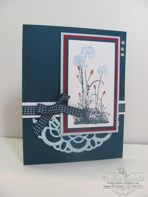 Robbie, I love everything about this card. The flowers are framed so nicely in colors, and the doily cut beneath the ribbon is something I never think of — thanks for reminding me to do it once in a while. Great challenge.