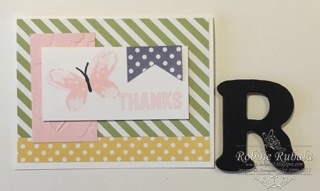 I decided to use some of our patterned paper. I used the Subtles patterned paper stack since all of these colors are in the subtles collection. I love the use of stripes and dots together so I did some combining of the two. For the vertical panel I decided to use an embossed piece rather than another piece of patterned paper. I used the Fluttering embossing folder to carry the theme of the butterfly on the main panel to the background. I used a retired sentiment to finish off my card. Here is my creation.
