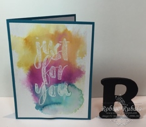Recently there have been a lot of watercolor backgrounds on the internet. I saw several ideas that I wanted to try so I decided to use a simple watercolor resist as my first attempt. To do this one you have to stamp your image and emboss it on watercolor paper. I chose to use the Botanicals For You stamp set which is a Sale-abration set. You can emboss it in any color you want but I chose to use clear. *A trick to making this work well is to make sure you have good coverage of your image when you emboss it.* If you look closely at mine, you can see my sentiment does not pop really well. Apparently my Versamark pad was not juicy enough to cover all of the paper so when I embossed it there was some areas not embossed so the ink colored it in.