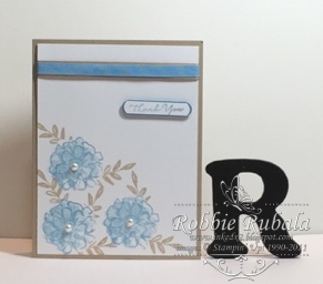 I decided to use a cute Sale-abration set I got – What I Love. I chose to use a little bit different color for the flowers. I picked Marina Mist and Crumb Cake. To do the flowers I used the larger solid image and inked it up. I then off stamped it 2 times before stamping on my card stock. I then used the other solid image and off stamped it 1 time before stamping it on top of the other flower I had stamped. I used the outline image and inked it up and stamped it full strength on the flower already created. That gave me the different shades I needed for my flower. I created a couple of masks for the flower so I could stamp the leaf spray. I used Crumb Cake for the leaves. I went with pearls rather than rhinestones for something different on this card. After I had my front panel stamped, I layered my ribbons. I only needed to stamp my sentiment and punch it out. Here is my final creation.