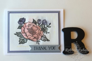 I loved these colors but decided to use the Blushing Bride, Smoky Slate, and Wisteria Wonder. I thought I would do some watercoloring. I took my piece of watercolor paper and I inked my stamp up with Versmark and then stamped it in the Memento Tuxedo Black. I stamped my paper and sprinkled on clear embossing powder. I heat it set the powder. The paper was taped down to my board and I spritzed the paper with water. I added some ink refill to the lid of the stamp pad and picked up some of the ink with the aqua painter. I touched it to my image where and wanted the color and let it spread. I repeated this process until my entire image was colored. I let it dry and then could assemble my card. Some of my ink bled over the embossing. I think it was because my paper was warped from heating it. I need to see what I can do next time to avoid this. Here is my finished card.