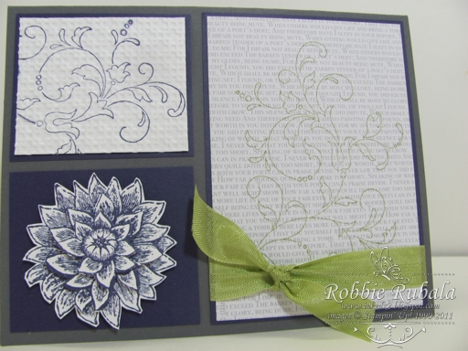 I am so glad this set did not get cut from the new catalog. I love this set. I had fun with the swirl on this one. The small rectangle at the top is also embossed. Here is my creation.