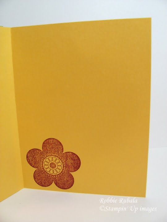 I saw the sketch challenge at Create with Connie and Mary and I knew I could use it for a redo of a card I made that I was going to use for convention. I stamped the large flower punch with the Fine Flourish using So Saffron ink. I wanted the flower to have some dimension to it. In my original card I had used rhinestone brads. Since I did not have enough for my swap, I punched a 1/4″ circle added a glue dot and then stuck it in Dazzling Diamonds glitter. I did change and use the new Pear Pizzazz for the strip and leaves rather than Wild Wasabi. I stamped the vine from Vintage Vogue on the strip with Versamark. I was not able to preorder the new In Color pads so when I place my order this weekend I will pick up some of them. I did change a few things to make it work for me. Here is the sketch and my creation.
