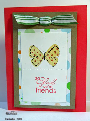 Stamps: Flight of the Butterfly, Best Yet (retired) Paper: Cameo Coral, Kraft, white, Rainbow Sherbert DS Ink: Cameo Coral, So Saffron, Palette Noir Black Accessories: Wild Wasabi ribbon (retired), mat pack, 2 way glue pen, Art Institute Coral Reef glitter, hand held single slit punch, dimensionals