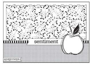 When I saw this layout I could not find any ephemera that would work the way I wanted. So I decided to flip the sketch and make it work for me. I had a piece of pattern paper I wanted to use that had Christmas images on it. It was a strip so used it in the lower left hand side of the card. That meant I also had to move the apple element as well as the sentiment.