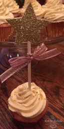 Jess saw online these cute cupcake toppers that were stars and decided she wanted to use them. She bought some lollipop sticks and I used our gold glimmer paper and stars framelits to make the toppers the only other thing I needed to do was add some ribbon. As luck would have it I had some pink and gold ribbon. Here are the toppers Jess used for her fabulous made from scratch strawberry cupcakes!