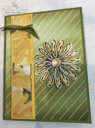 I chose to use the Daisy Delight Suite as I love daisies. The papers in this Suite are gorgeous! I looked through the papers and chose one that had large yellow daisies on the front and a green diagonal stripe on the back. I used the striped paper as a layer for my card front. The yellow daisy side was cut at 1 inch and mounted onto Daffodil Delight. As part of this suite there is a yummy Old Olive chevron ribbon. I tied this around the top of the daisy layers. This ribbon ties so nicely!. This panel was mounted onto the left hand side of the card front with dimensionals. I used the stamp set to stamp 2 of the daisies onto white card stock with Memento ink. The new daisy punch was used to punch both of the stamped images out. A Daffodil Delight marker was used to loosely scribble on color. I wanted this messy as the stamp set is fun. The center of one of the daisies was colored in using the marker also. The 2 daisies were layered with dimensionals. To finish off the flower I added one of the new Faceted Gems to the center. These are so sparkly – and you know me and my bling! – and they are bumpy! The finished daisy was added to the card front. Here is my creation!