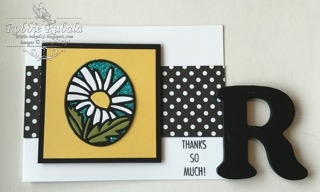 I purchased the That’s the Tag bundle as I love the daisy.  I decided to use the daisy die to create a fun stained glass effect.  The frame was cut out of Basic Black.  I also cut out a solid oval from the Sale-abration Bermuda Bay glimmer paper.  Using the daisy die, I cut out the flower petals with white, the flower center with Daffodil, and the leaves with Olive.  Using Tombow glue, I added dots of glue to the back of all the pieces.  The glue was allowed to set some before adding the frame to the glimmer paper.  The same procedure was used with the petals, flower center, and leaves.  Once the oval frame was finished I used the flower frame to cut an oval out of the piece of Daffodil card stock.  The Daffodil card stock was then attached to the Black.  The flower frame was added into the cut out using Tear & Tape.  A strip of black polka dot dsp was added to the front of a Whisper White card stock.  The sentiment was stamped in the lower right hand corner with Memento Tuxedo Black ink.  To finish the card the frame panel was attached using dimensionals.  Here is my completed creation.