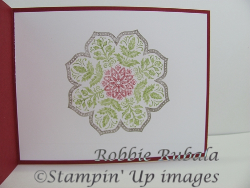 I have been wanting to use my Days of Gratitude stamps with Christmas colors and this was the perfect challenge to use it with. I began by coloring the large medallion stamp with my markers. When I stamped it I remembered doing one earlier this year where I used Iridescent Ice over the image so it was sparkly. I decided to do the same with this one. The idea came from Frenchie at Stamp & Scrap with Frenchie. Once your image is stamped you stamp over it with the same image using Versamark and then emboss it with Iridescent Ice embossing powder.