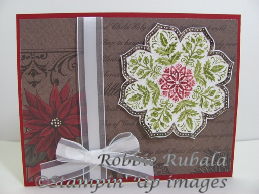 Now I have my medallion and I needed to design my card. I have a lot of Christmas paper left and wanted to use some of that up before the season is over so I chose a piece of Deck the Halls paper. I added some ribbon and a bow and mounted it on a card base and I was done. Here is my creation.