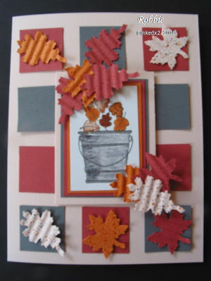 Stamps: Itty Bitty Backgrounds, Basket Full of Fun (retired) Paper: Basic Gray, Blush Blossom, Pumpkin Pie, Really Rust, white Ink: Basic Gray, Pumpkin Pie, Really Rust, Palette Noir Black Accessories: Blush Blossom – Chocolate Chip – Pumpkin Pie – Really Rust markers, 1″ square punch, leaf maker punch (Creative Memories), crimper, Silver Gray marker (Marvy), Sakura clear – Copper – Silver Stardust Gelly Roll pens, aqua painter, Zots, dimensionals