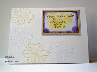 The Flourishes blog wanted you to make a card or project where the sentiment was the main focal point. I ran across this sentiment while looking through my stamps and I knew it would be perfect for the Fifth Avenue Floral set. I also tried something new on the the stamped sentiment. I used Almost Amethyst, Elegant Eggplant, and So Saffron inks to sponge from the inside towards the outside. I started with So Saffron in the middle, then I used Almost Amethyst from the edge of the So Saffron to the edge of the card. I finished with Elegant Eggplant on the very edges. I like the effect, what do you think? To finish off the card, I had a flower charm that I added to dangle in the lower right hand corner of the sentiment layer. So here is my creation.
