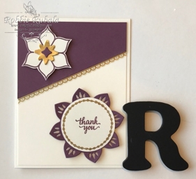 The idea for the layout of this card came from a layout for a scrapbook challenge.  I like the layout and decided to use it for my card.  My card base is Very Vanilla and I cut a smaller panel out of Very Vanilla also.  Using a piece of Fresh Fig card stock I cut a rectangle and then cut the rectangle at an angle.  The angle was attached to the panel.  The stickers in the Suite have borders so I used one of them to follow the bottom angle.  Using a scrap of Vanilla I stamped the flower shape with the Fresh Fig ink.  The matching framelit was used to cut it out.  I needed my layers so I used some Gold Foil paper and cut out one of the smaller shapes and then the smallest shape is cut out of Fresh Fig card stock.  The shapes were layered onto each other using glue dots to get a flower shape.  This flower was then added to the upper left hand corner of the panel with a dimensional.  The flower at the bottom was created by cutting the connecting pieces of the shape from the square to release the flower shape.  I used some scrap Vanilla to stamp the circle element and emboss with gold embossing powder.  The sentiment is part of the set so I stamped it in the center using the Fresh Fig ink.  These 2 elements were layered and then added to the panel using dimensionals.  Here is my completed creation.