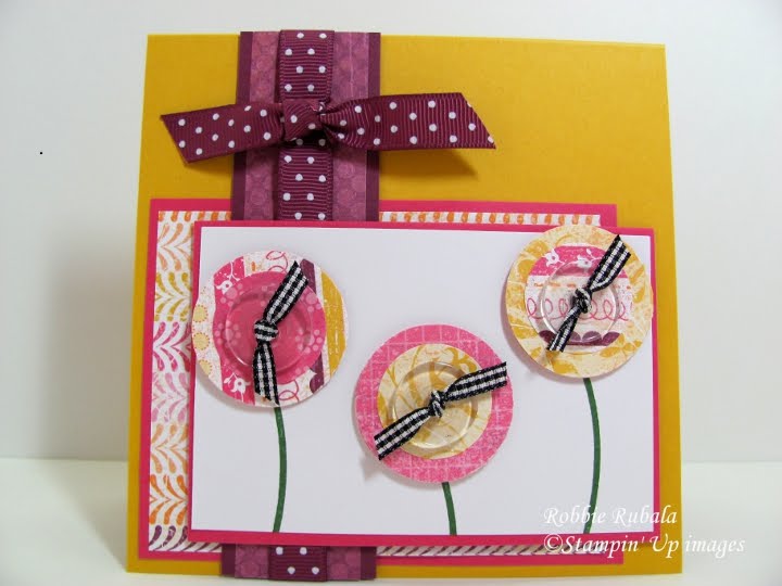 Stamps: Petal Pizzazz Paper: Crushed Curry, Melon Mambo, white, Razzleberry Lemonade DS Ink: Garden Green Accessories: 1 3/8″ & 1″ circle punches, Rich Razzleberry polka dot ribbon, black & white gingham ribbon, sticky tape, dimensionals