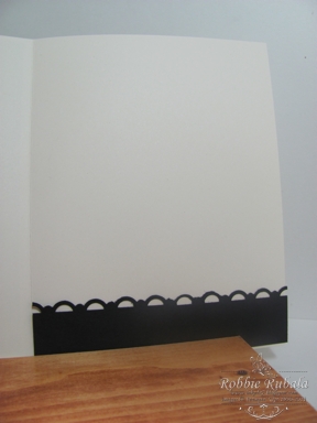 I cut the top note die out and then used the embossing folder. I added a bow of 1/8″ black taffeta. I mounted that on a piece of black that I edge punched. This was mounted on a vanilla cardstock base. I spritzed everything with frost shimmer paint. To finish off the inside, I punched a strip of black and added it to the bottom of the card. Here is my creation.